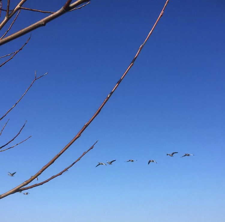 De ganzen die zijn achtergebleven want te laat, te moe.. of weet ik het, lachen hun terugkerende soortgenoten uit.